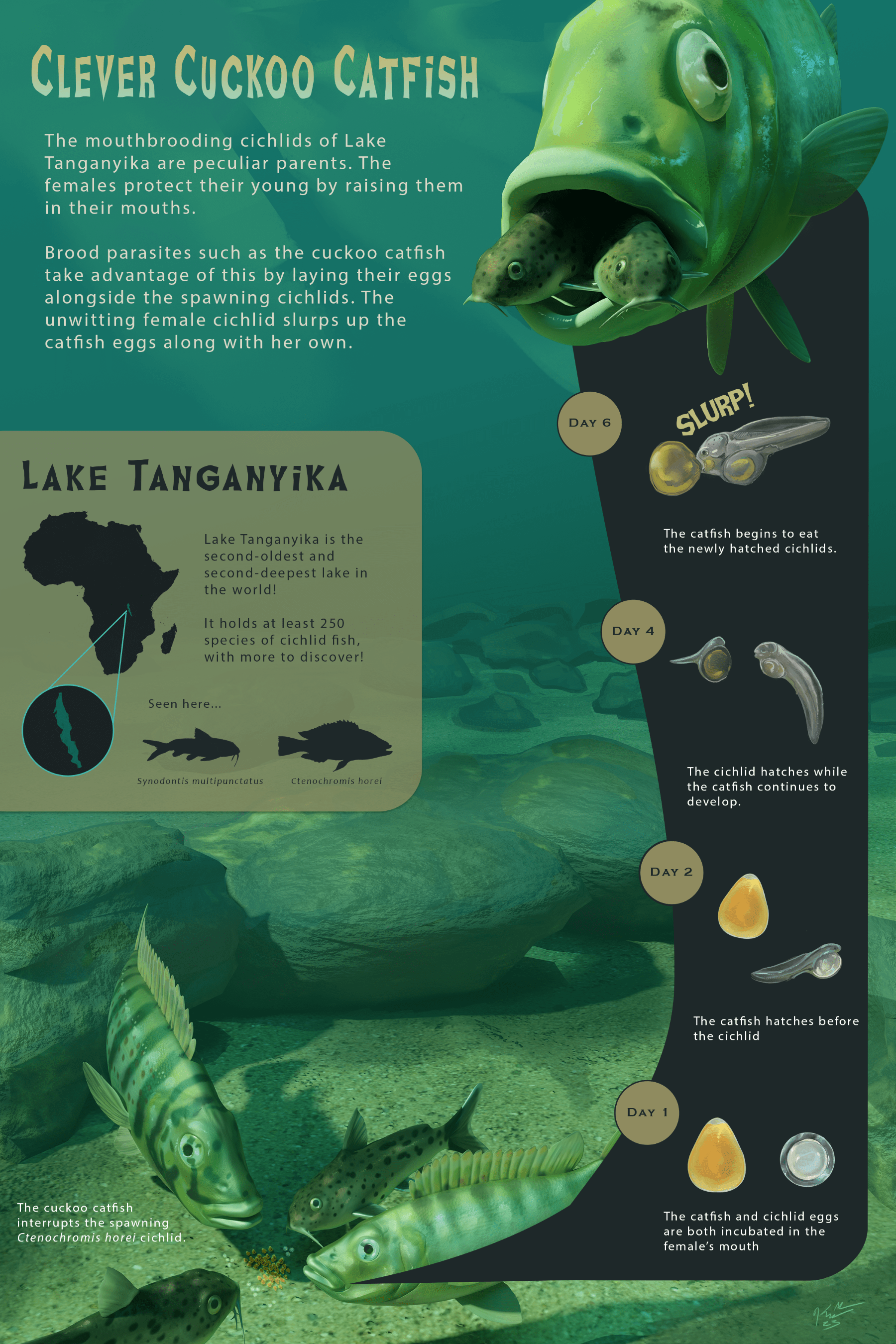 An educational poster about the cuckoo catfish and its unique brood parasitism behavior, designed to cater to a younger audience.